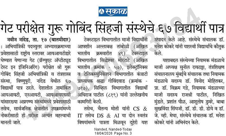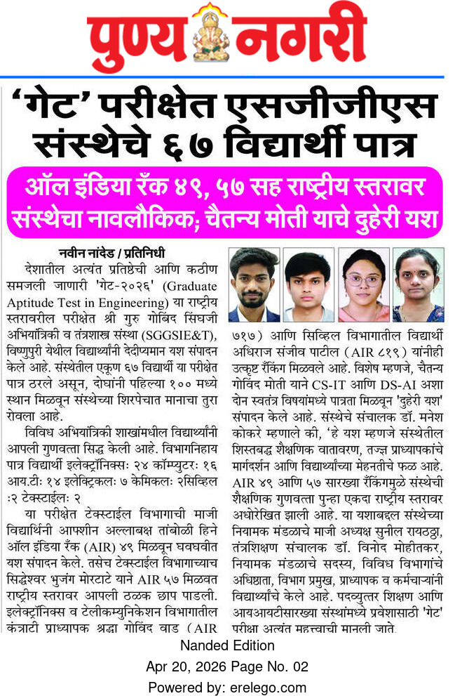 Shri Guru Gobind Singhji Institute of Engineering and Technology (SGGSIET), established in 1981 in Nanded, is recognized as a prominent institution in technical education, research, and technology transfer. From the beginning, the institute has focused on student-cantered learning and is dedicated to achieving academic excellence. The campus covers 46 acres and is characterized by its cleanliness and greenery. It receives 100% grant-in-aid from the Government of Maharashtra.